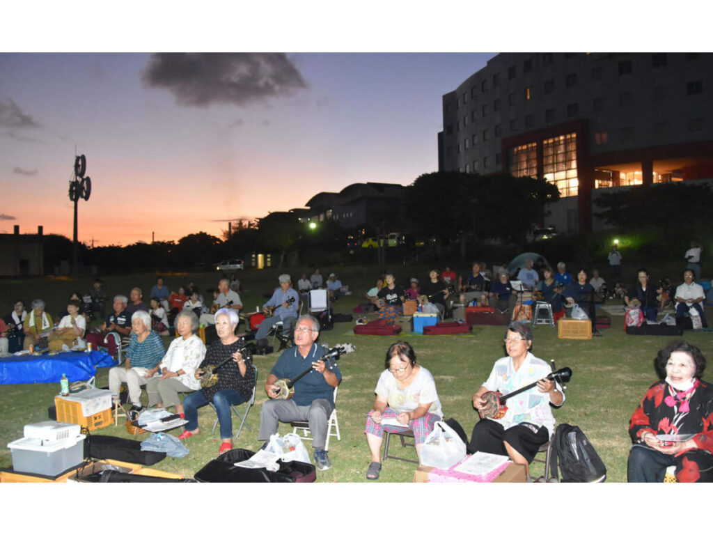 沖永良部民謡協会主催の音楽イベント「浜風とぅ唄遊び」が9月27日夕、鹿児島県知名町のメントマリ公園であった。参加者は島唄や民謡に合わせて三味線を弾いたり、歌ったり、曲をさかなに飲食を楽しんだりと、思い思いに唄遊びを満喫した。