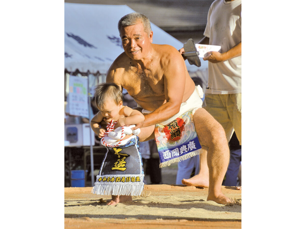 西岡さんは、阿木名出身、在住。3人の娘がおり、長女の子ども2人も女の子。昨年10月、次女の山下穂奈美さん(31)に初めての男の子が生まれ、孫との土俵入りが実現した。
