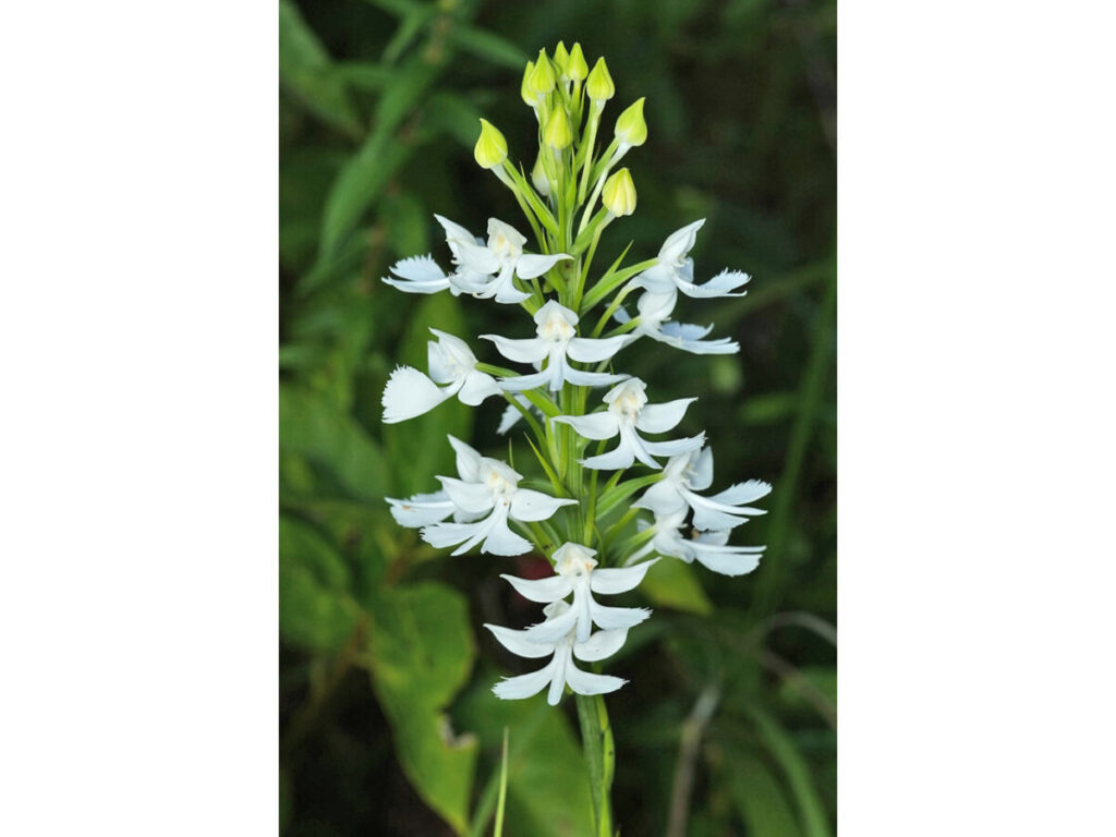 ダイサギソウは千葉県以西に分布する地生ラン。日当たりの良い草原や林縁に生え、秋に美しい純白の花を咲かせる。開発や園芸採取などで減少し、環境省レッドリストで絶滅危惧ⅠB類に位置付けられている。