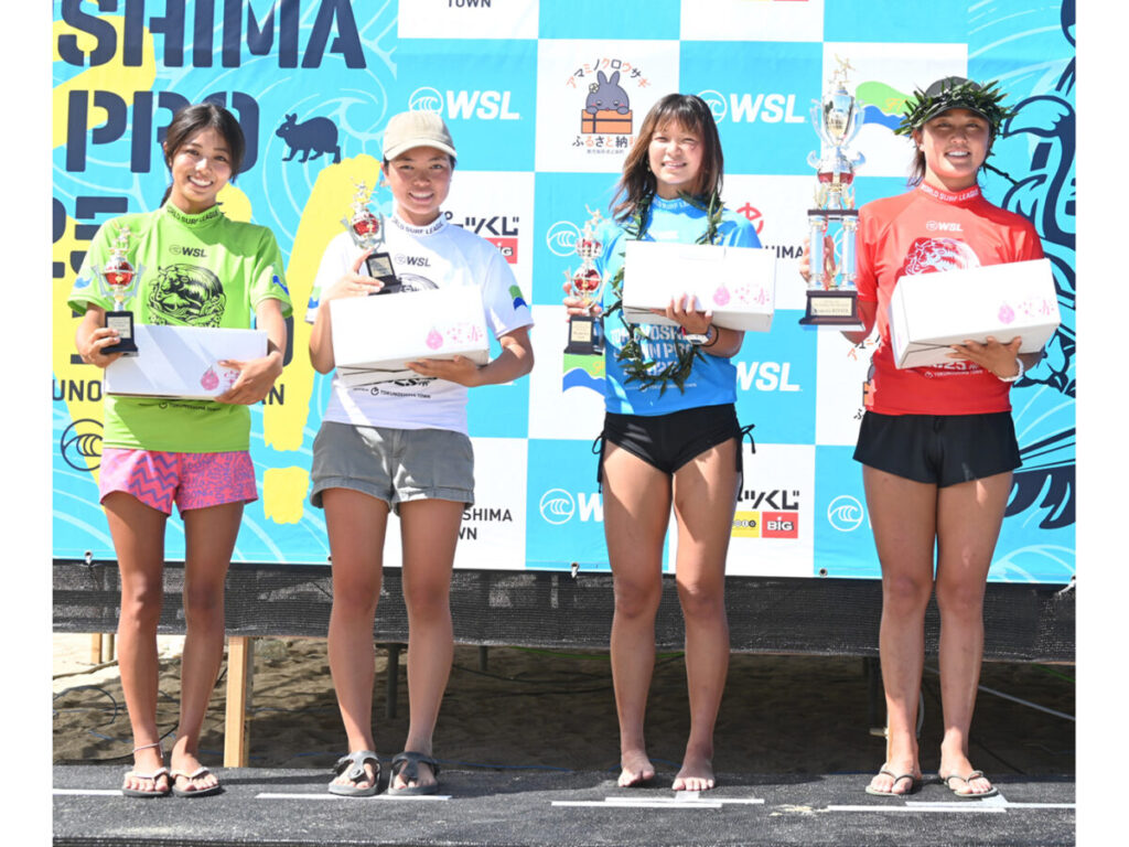 表彰式で笑顔を見せる(右から)川瀬心那選手、芳田花瑚選手、山田佳那選手、青山湖音選手=19日、徳之島町花徳浜