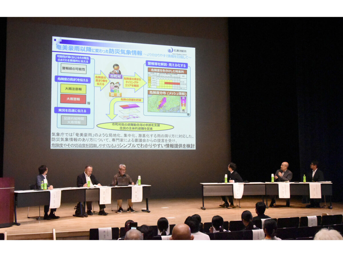 シンポジウムは地域防災力や一人一人の防災意識の向上などを目的に、気象庁鹿児島地方気象台名瀬測候所と奄美市が共催。約80人が来場した。会場では奄美豪雨を振り返るパネル展示や、来場者へ備蓄用食品の配布もあった。