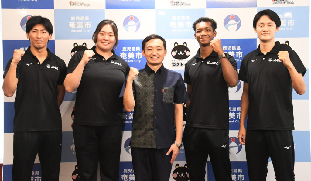 パリ五輪女子やり投げ金メダリストの北口榛花選手ら世界で活躍する日本航空(JAL)所属の陸上4選手が24日、鹿児島県奄美市の安田壮平市長を表敬訪問した。同日に奄美市で始まった「JALアスリートアカデミーin奄美」で地元の子どもたちを指導するため来島。同プログラムや合宿で過去にも奄美を訪れている北口選手は「(このプログラムは)子どもたちから元気をもらって、次のシーズンまた頑張ろうって気持ちにさせてもらえる特別な機会」などと語った。