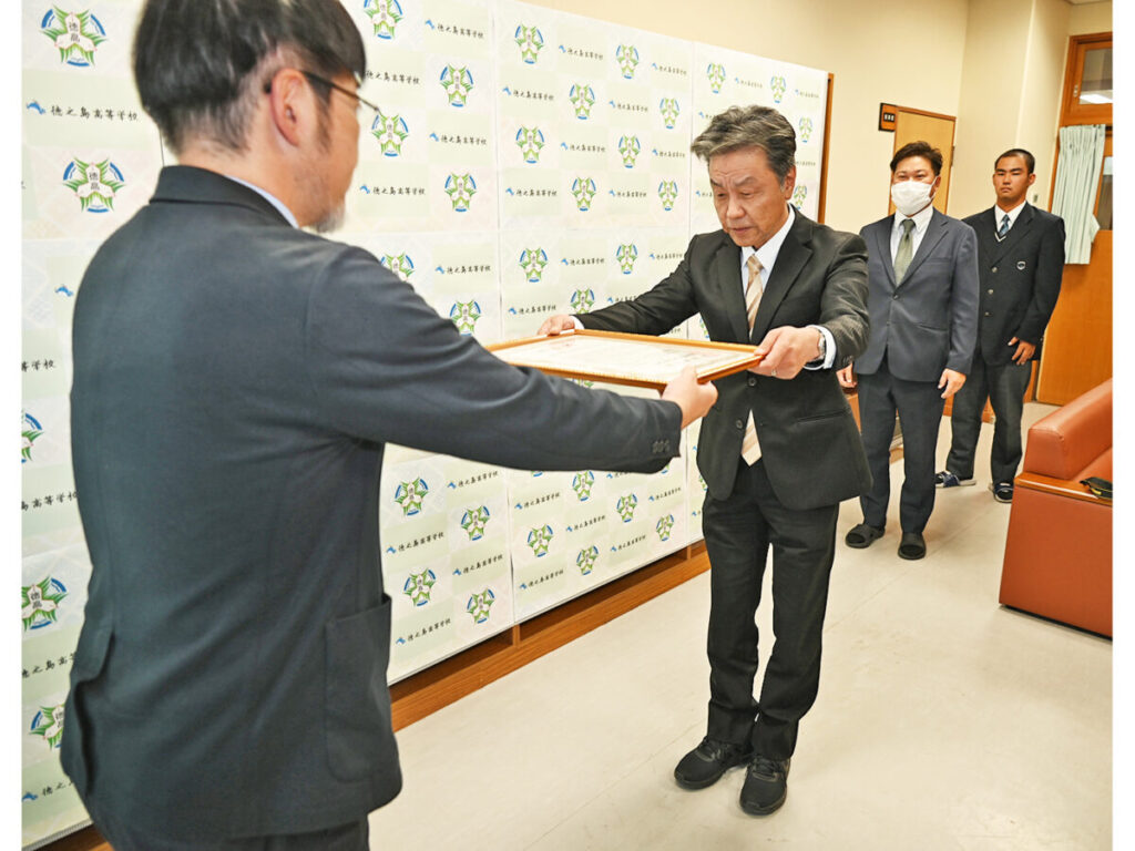 県高野連からの21世紀枠推薦校の表彰伝達を受ける上田勇一校長(左から2人目)=1日、徳之島高校