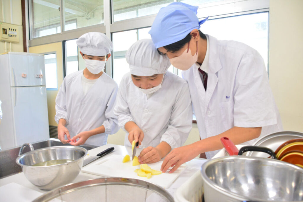 生徒らは、玉ねぎの切り方や包丁、ピーラーを使ったジャガイモの芽の取り方など、料理のこつを分かりやすくレクチャー。児童らは熱心に耳を傾け、積極的に取り組んだ。