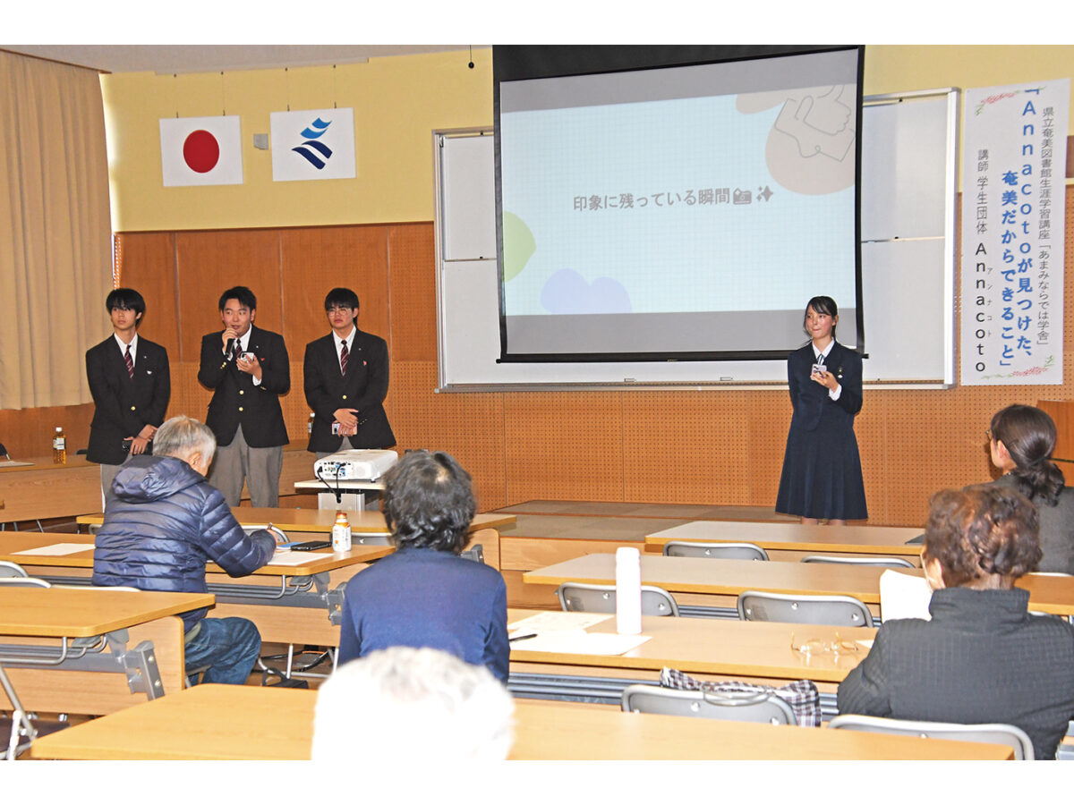 鹿児島県立奄美図書館の生涯学習講座「あまみならでは学舎」の2025年度第6回が10日、奄美市名瀬の同館研修室であった。地元で活動する学生団体「Annacoto(アンナコト)」のメンバーが設立のきっかけや活動実績を紹介。「奄美は挑戦しやすい島」と述べ、周囲の支えに対する感謝や郷土愛、今後の展望などを熱く語った。
