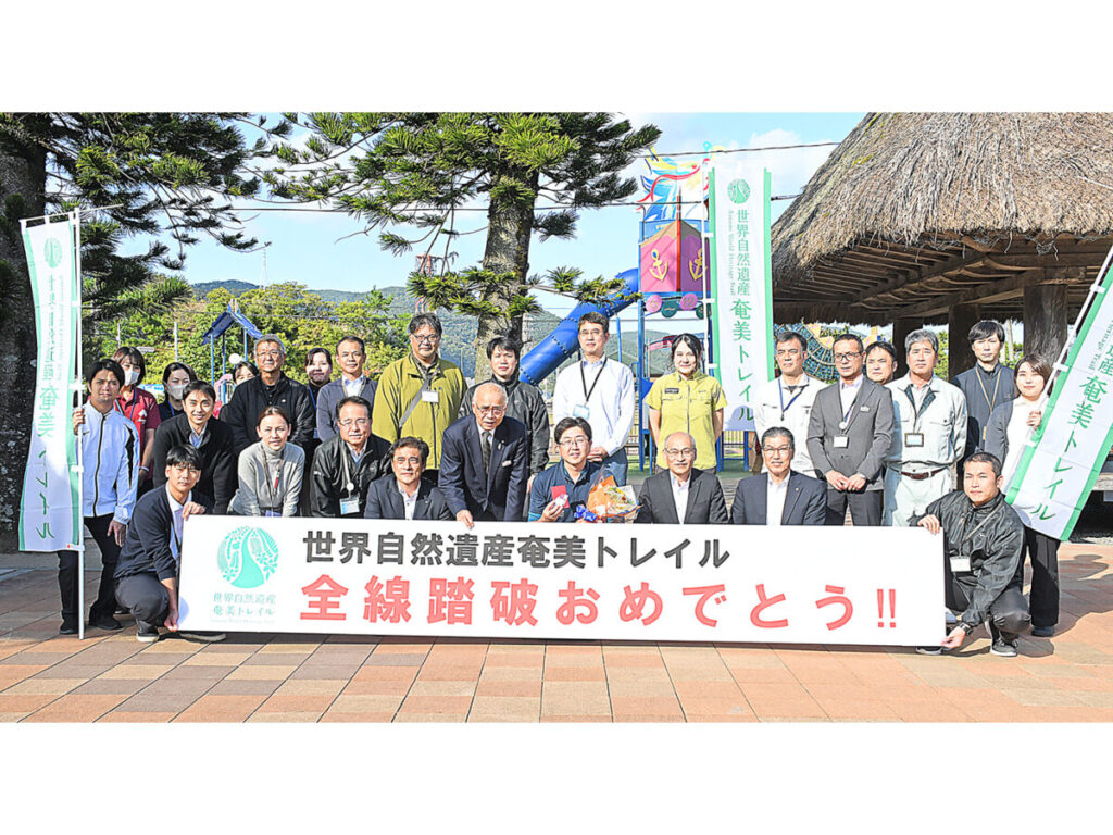 19日はゴールの龍郷町「りゅうがく館」前で同町や県などの関係者約40人が踏破を祝った。川瀨さんは「五感で奄美の良さを感じた。トレイル中は各地で地元の方にも応援していただいた」と感謝し、「これから訪れる方も温かく迎え入れていただければ」と話した。