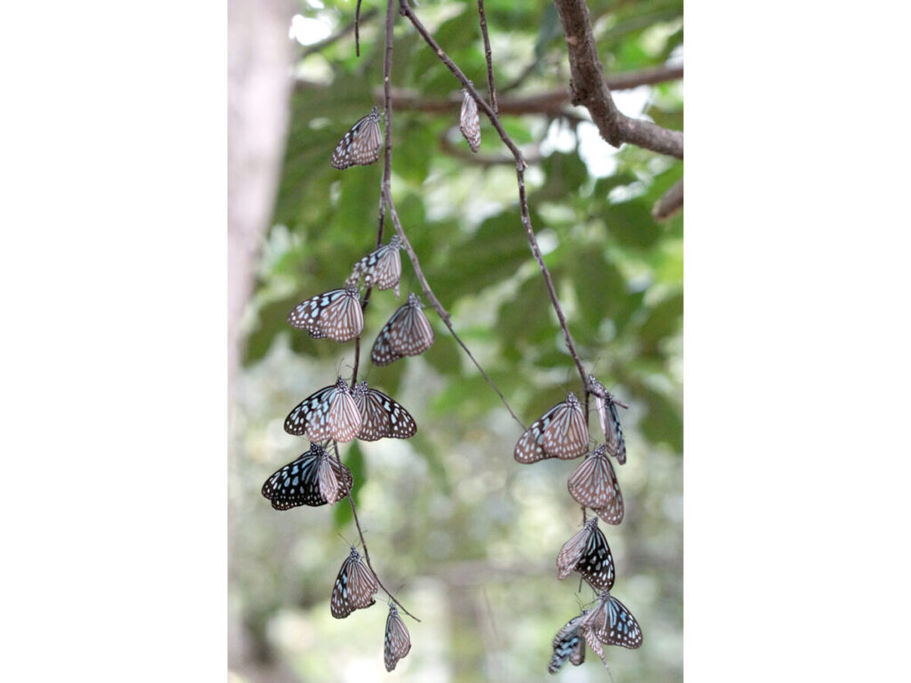 奄美大島北部の海岸に近い森では、風の当たらない谷間にリュウキュウアサギマダラが集まり、細い枝に鈴なりにぶら下がりながらじっと春の訪れを待っていた。