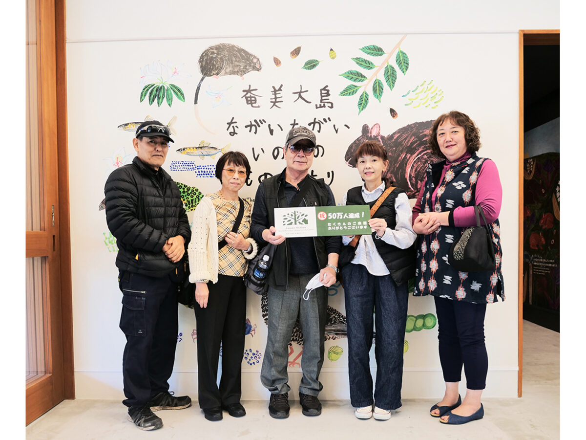 鹿児島県奄美市住用町の奄美大島世界遺産センターは15日、来館者50万人を突破した。2022年7月の同センターオープン以来、約3年8カ月。この日、同センター職員がオランダから訪れた50万人目の若水洋子さんの一行を温かく出迎え、記念品を贈呈し、館内を案内した。